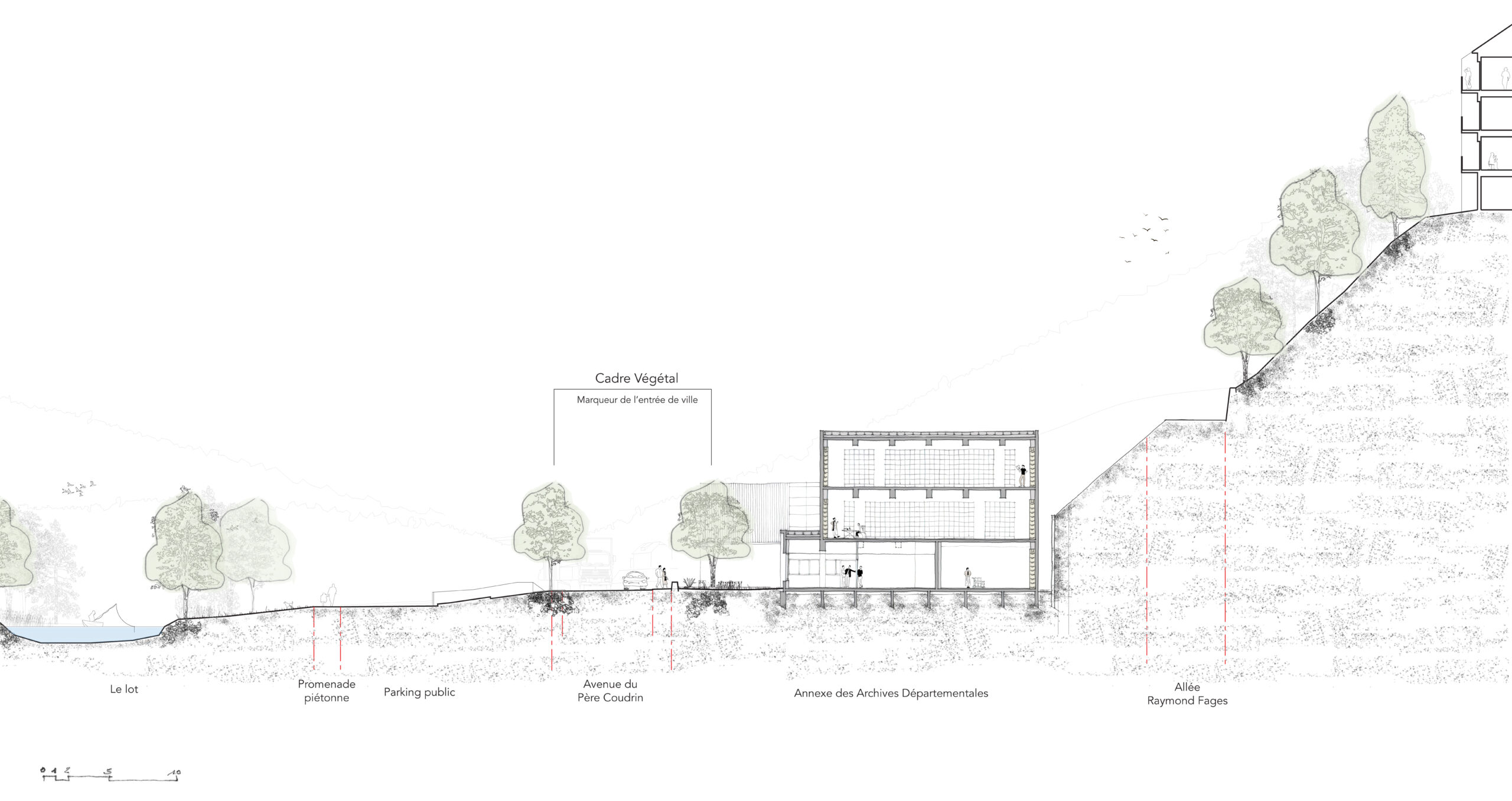 Le projet porte sur la construction d’annexes pour les archives départementales de la Lozère, non loin de celles-ci, dans un quartier mixte en entrée de ville.