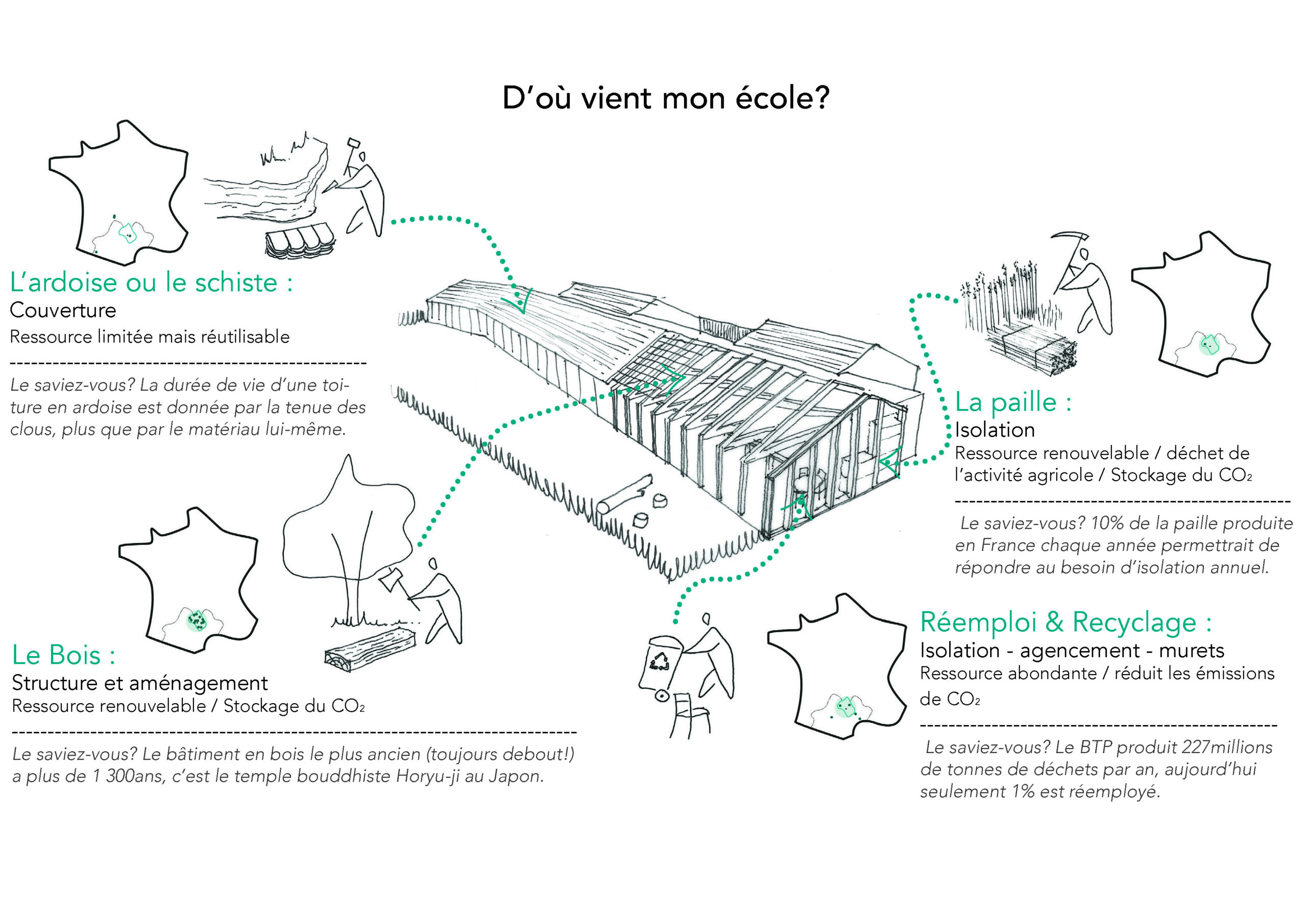 + S’ancrer dans le territoire : par la réinterprétation de formes rurales locales (la Jasse), l’usage de matériaux naturels et locaux (bois, paille, chanvre, ardoises, schiste, pierres), le dialogue avec le paysage et la prise en compte du climat local dans la conception et l’implantation du bâtiment.