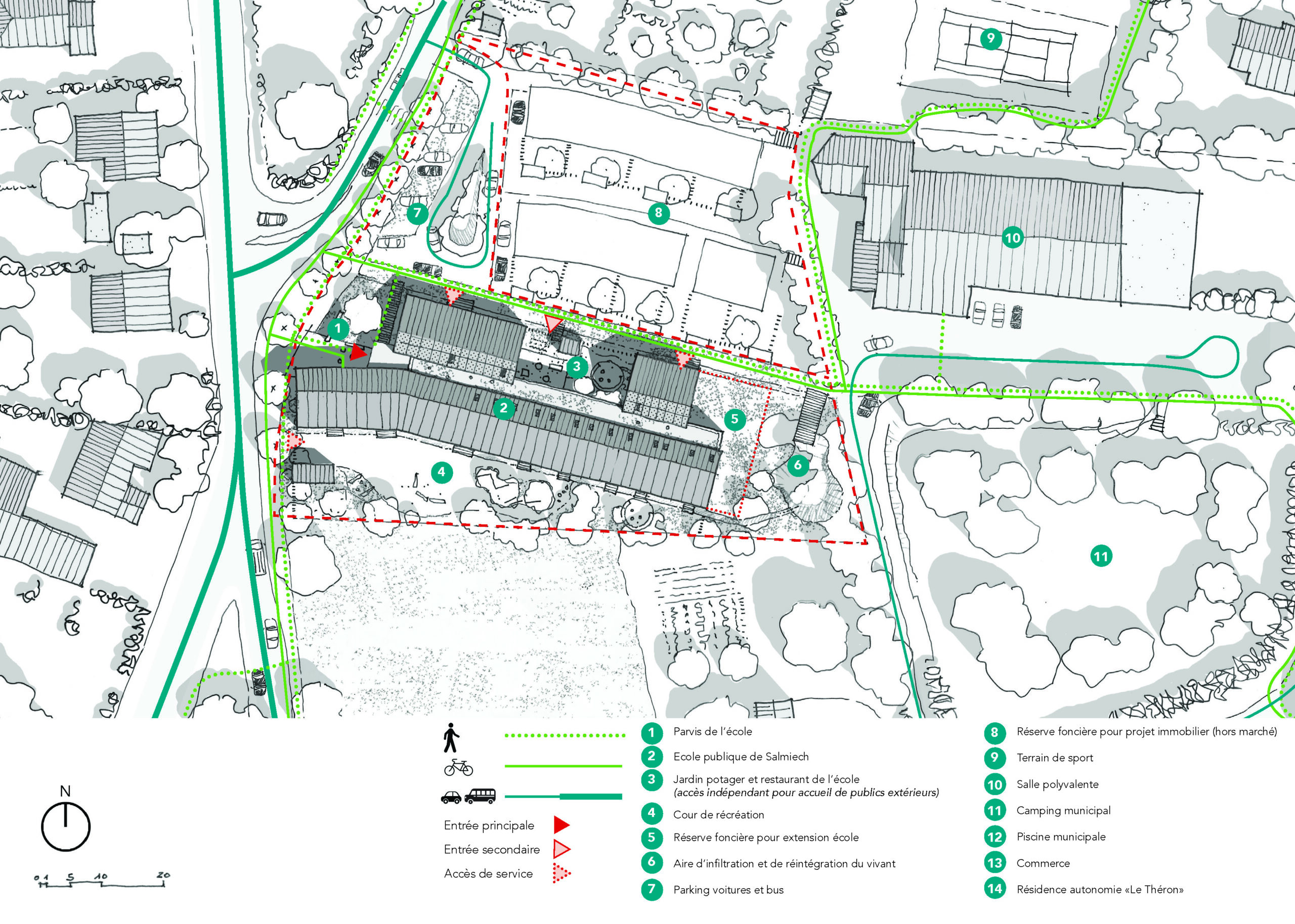Le projet est une école rurale implantée en lisière du village de Salmiech (Aveyron), pensée comme un lien entre différentes parties du territoire (centre ancien, faubourg, quartiers récents).
