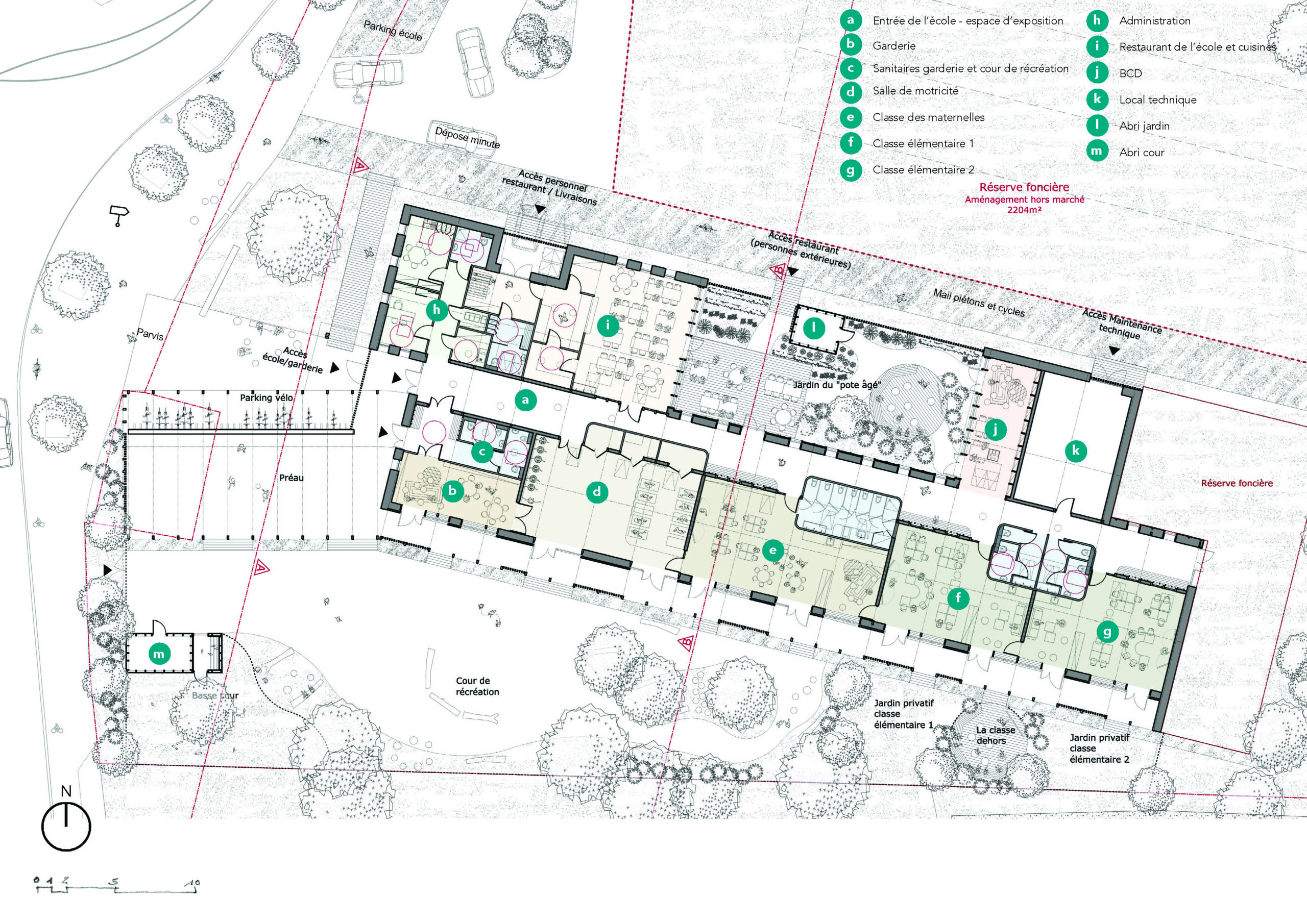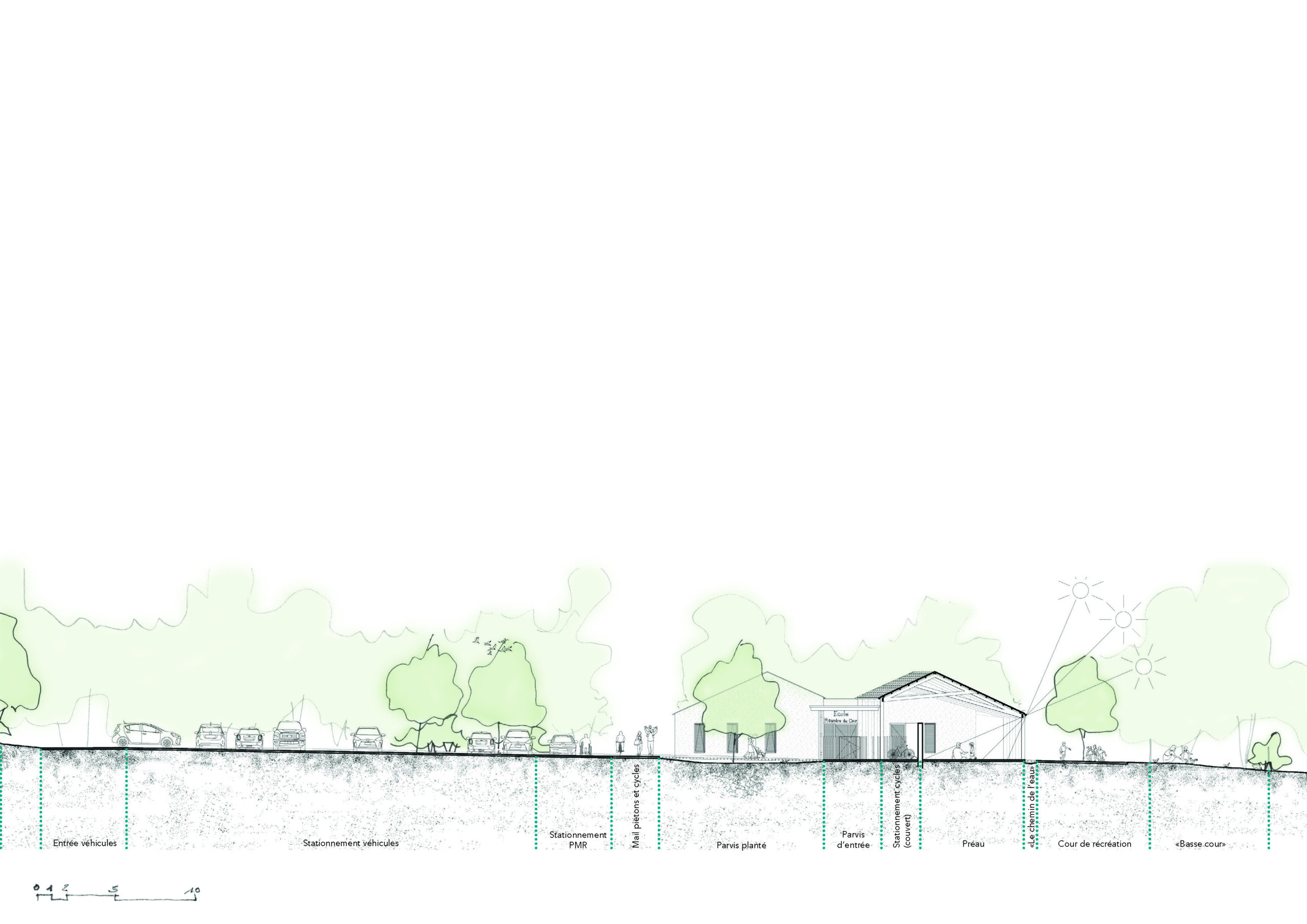 L’école est traversante et traversée, avec une circulation en « venelle » reliant les différentes fonctions (préau, classes, garderie, sanitaires, restauration, …).