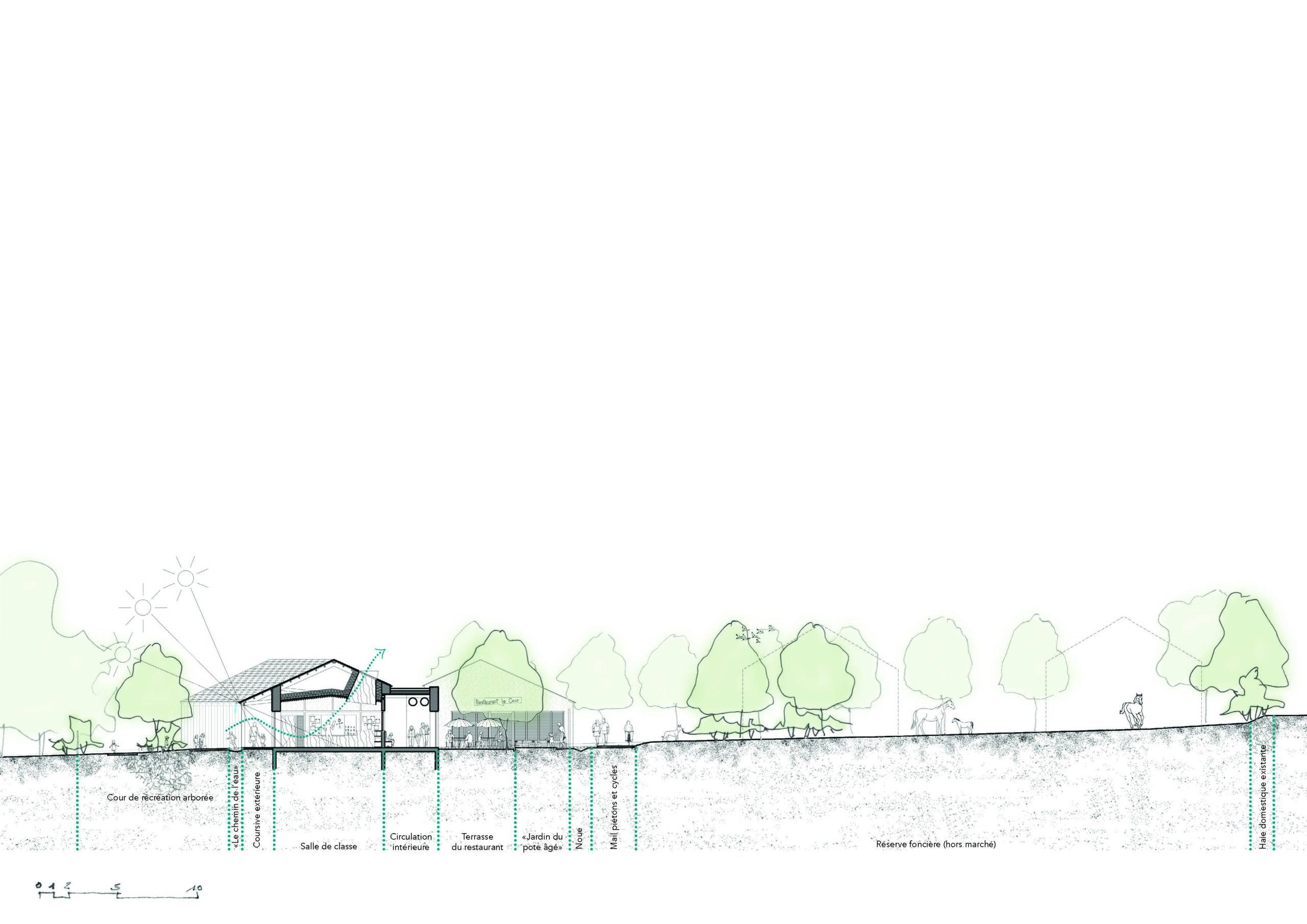 + Intégrer le vivant : par la présence forte et souhaitée de la nature (jardins, potager, poulailler, …), la gestion de l’eau (prédominance de sols perméables, EP conduites dans un bassin drainant paysager), et la sensibilisation d’un public divers : enfants, parents, habitants du village… à travers des ateliers d’initiation à la faune et à la flore locale et de « ménagement » des abords de l’école.