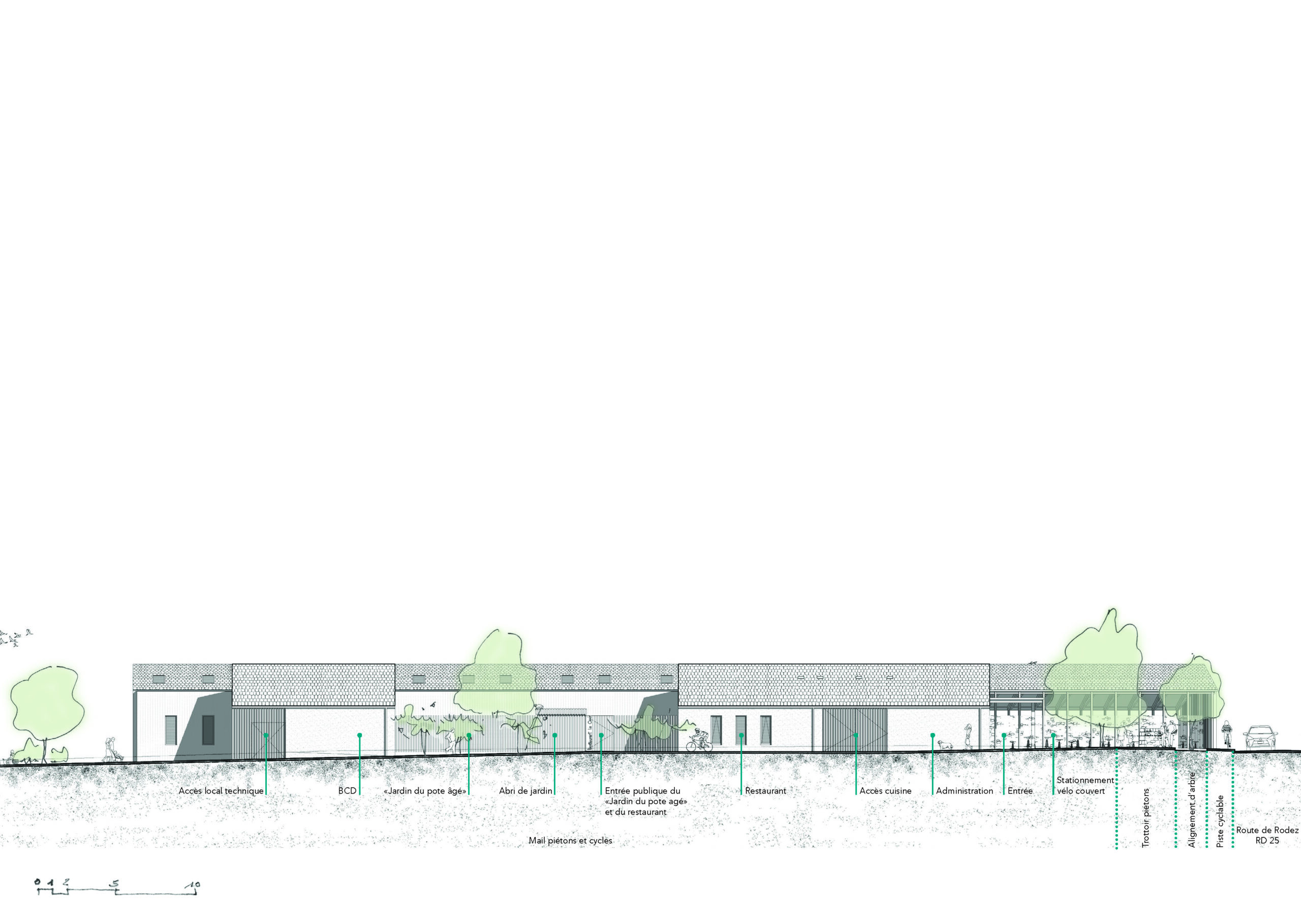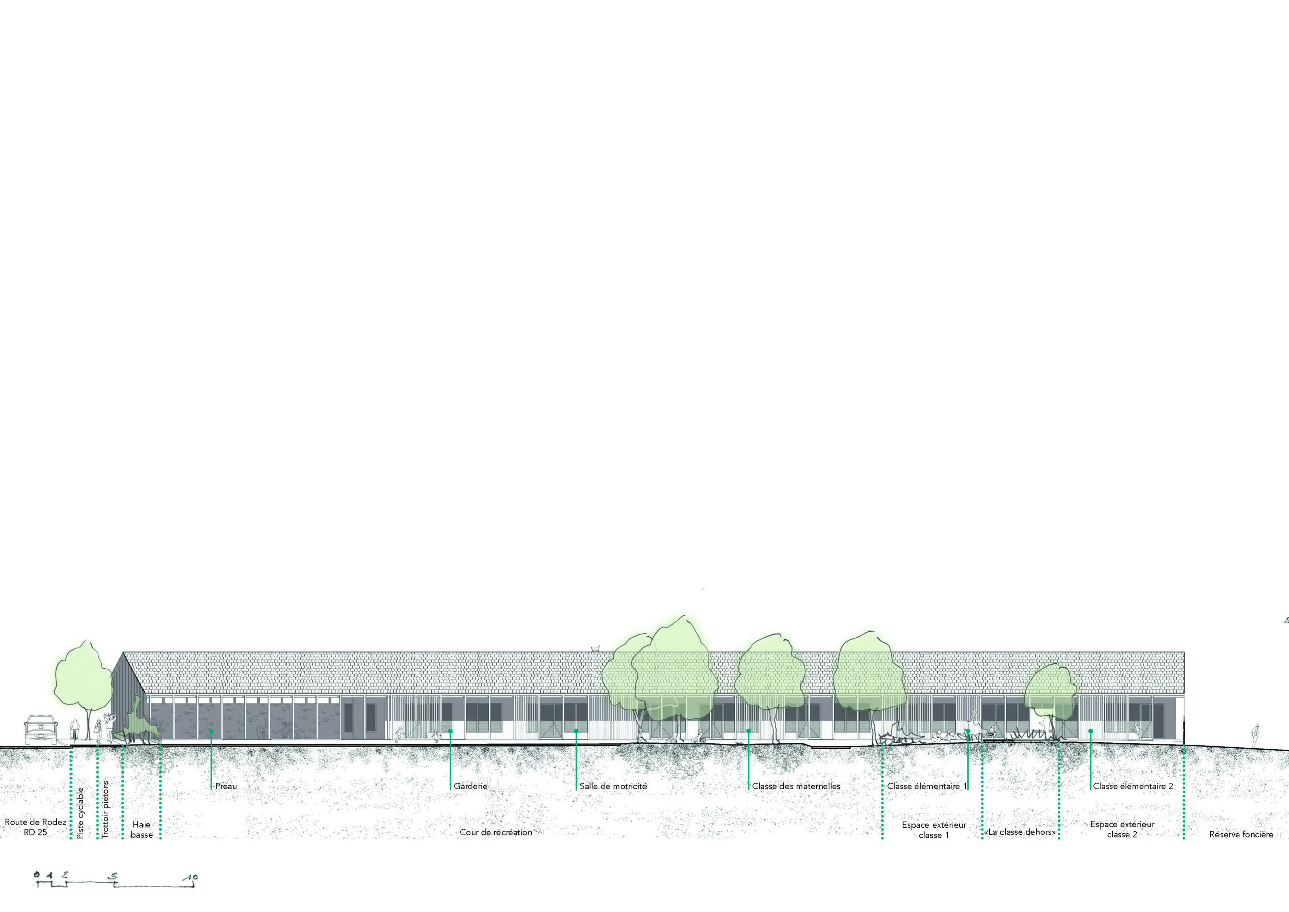 Le bâtiment s’organise en volumes simples, s’inspirant de la Jasse, architecture vernaculaire du Lévézou. Long et étroit, coiffé d’une toiture à deux versants, le bâtiment principal s’accroche à la limite Ouest par le préau, porte d’entrée de l’école. Une seconde Jasse, fragmentée en volumes construits et non construits, accueille deux volumes habités autour d’un jardin clos, offrant lumière, fraîcheur, vues et rapport au sol.