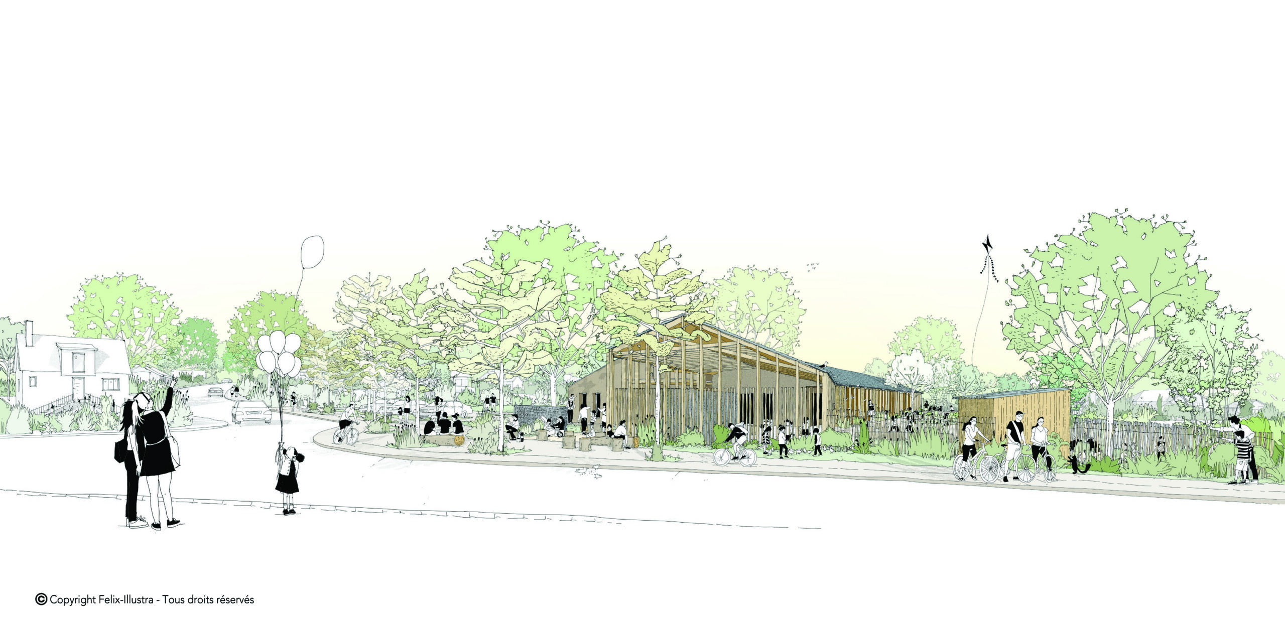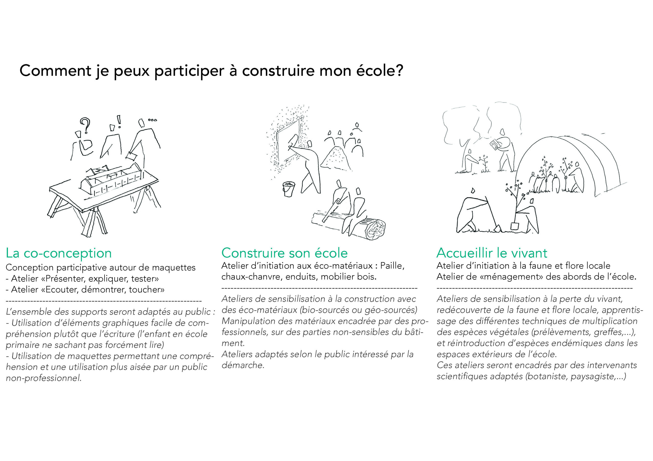 + Impliquer les usagers : par une démarche participative (habitants, enfants, enseignants, …) dès la conception, et même dans certaines phases du chantier (atelier de co-conception et d’initiation aux éco-matériaux).